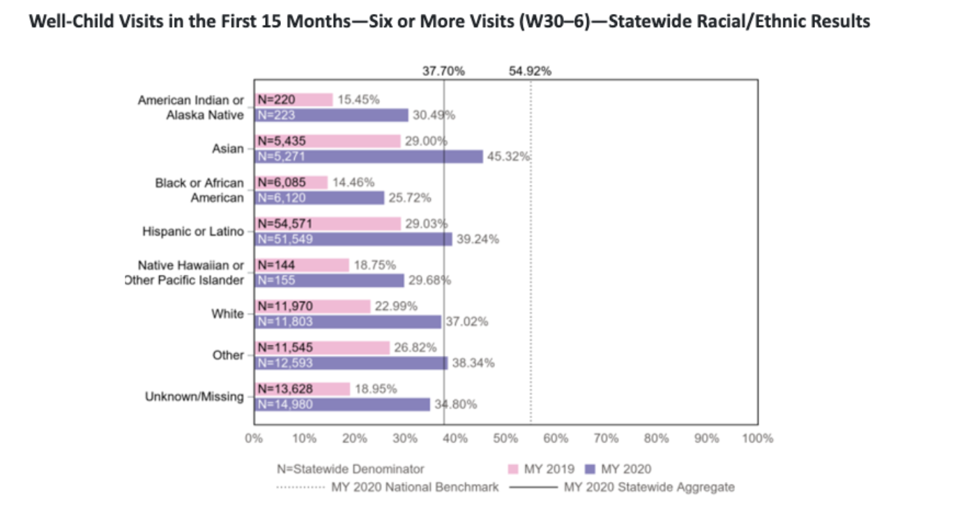 A decline in plan performance between 2019 and 2020 impacted certain racial/ethnic groups and primary languages disproportionately, on top of disparities in rates that already existed. This indicates that managed care plans need to specifically improve how they outreach and provide care to families of color. For example, in 2020 developmental screening rates were significantly lower among American Indian/Alaska Native and Black children. In addition, well-child visit rates in the first 15 months of life were significantly lower among American Indian or Alaska Native, Black, and Native Hawaiian children. See the charts below from the 2021 Preventive Services Report for current disparities in well-child visit and immunization rates.